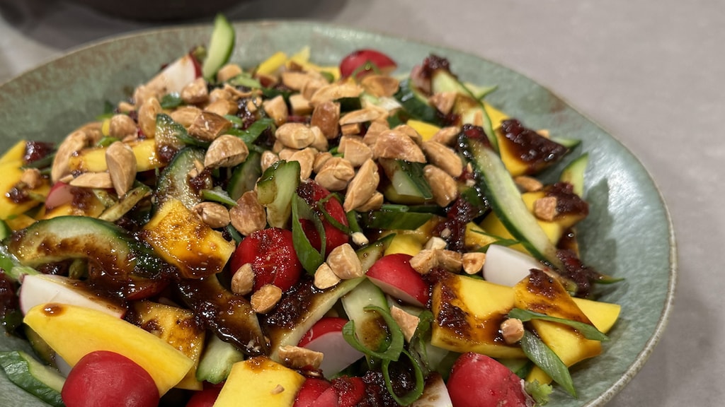 Stap 7: Schil en snijd de mango in blokjes en meng met de komkommer, bosui en radijs.